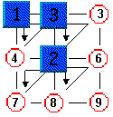 Amb aquestes funcions hem de trobar una manera de resoldre�l. Observem que podem posar les peces 1, 2 i 3 en quadrats diferents, com en el dibuix. Aleshores, amb les funcions (2,5,3) i (4,7,5) enviem les peces de les posicions 3 i 7 a les posicions 2 i 5 respectivament. Obtenim, doncs, el segon dibuix, que acabem de resoldre amb la funció (2,5,3) -1,que correspon a seguir el camí al revés, o el que és el mateix (2,5,3) 2 = (2,5,3) (2,5,3) = (2,3,5).